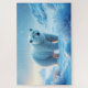 Um design de quebra-cabeça foto-realístico com um urso polar majestoso parado em uma paisagem nevada durante o pôr do sol. O urso encara o espectador diretamente, com um olhar sério e focado. Seu pelo branco liso é iluminado por luz suave e quente, criando uma atmosfera pacífica e serena. Os flocos de neve caem suavemente ao fundo enquanto o sol se põe sobre a paisagem tranquila e congelada. Uma bela mistura de força, calma e beleza natural — perfeita para amantes da vida selvagem e fãs quebra-cabeça.