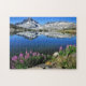 Flores cor-de-rosa no penhasco rochoso pelo lago azul