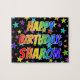 Este design de quebra-cabeça de jigsóis, divertido e com tema de aniversário, mostra a mensagem "HAPPY BIRTHDAY, SHARON" com os personagens que têm um espectro colorido de arco-íris inspirado em um padrão de gradiente, além de um padrão de fundo de campo estelar vibrante. Um quebra-cabeça vibrante como este pode ser uma maneira divertida de enviar cartões de aniversários a alguém chamado Sharon. [~Z0000468]
