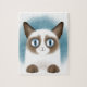 Gato siamês sorridente, de olhos azuis, com fundo azul.