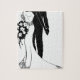 Um casal do casamento dos noivos na silhueta. Com a noiva em um vestido nupcial branco do vestido que guardara um buquê floral das flores e um teste padrão floral do laço em torno de seu vestido