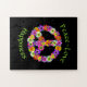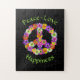 Este quebra-cabeça boho jigsee apresenta um sinal de paz floral em tons de rosa, amarelo, laranja, roxo, verde, branco e preto. "Paz, amor e felicidade" rodeia o sinal de paz.