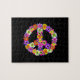 Este quebra-cabeça boho jigsee apresenta um sinal de paz floral em tons de rosa, amarelo, laranja, roxo, verde, branco e preto.