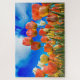 Quebra-cabeça colorida é uma homenagem ao Primavera - com uma bela fotografia que apresenta flores de pêssego, de tulipas brancas e amarelas sob um brilhante céu azul com nuvens brancas dispersas.