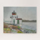Squirrel Point Lighthouse sits on the banks of the Kennebec River in Maine on a dark misty day. The opposite bank near Phippsburg is shrouded in fog. Lichen grows on the bell house roof and the rocks in the foreground. New spring grass springs up around the brush still bare from the long winter. Sargassum laps against the rocky shore showing how close the lighthouse is to the water.
