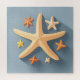 An illustration of a big yellow starfish with some other smaller starfish. Gray background.
