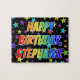 Este vibrante e animado design de quebra-cabeça com tema de aniversário tem a mensagem "HAPPY BIRTHDAY, STEPHANIE" com os personagens que têm um espectro colorido de arco-íris inspirado em um padrão de gradiente, junto com um padrão de fundo de estrelas excitante. Um quebra-cabeça colorido como este pode ser usado para enviar desejos de aniversário a alguém chamado Stephanie. [~Z0000468]