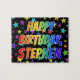 Esta design de quebra-cabeça de quebra-cabeça divertida e vivaz, com tema de aniversário, tem a mensagem "HAPPY BIRTHDAY, STEPHEN" com os personagens que têm um espectro colorido de arco-íris inspirado num padrão de gradação, além de um campo excitante de estrelas como padrão de fundo. Um quebra-cabeça empolgante como este pode ser uma maneira divertida de enviar cartões de aniversários a alguém chamado Stephen. [~Z0000468]