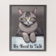 Quebra-cabeça, ilustrando uma cinza de aparência estéril por gato, com olhos amarelos piercing descendo as patas frontais sobre uma borda, mirando diretamente para a frente com um ar de autoridade séria. Abaixo do gato, o roteiro ousado diz, "Precisamos conversar", acrescentando humor e drama.