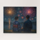A peaceful lakeside evening, where a couple in traditional yukata sits together, gazing at a brilliant fireworks display. Reflections of light ripple across the water, creating a dreamy atmosphere that captures the romantic spirit of a Japanese summer night. A perfect puzzle to enjoy both serenity and spectacle.