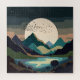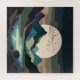 Uma paisagem abstrato de uma enorme superlua em uma cena de lago montanhês com um bando de pássaros em texturas ousadas e tons escuros de marrom, bege, bronzeado, azul, ciano e preto.