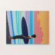 Quebra-cabeça num surfista parado na praia, silenciado contra um fundo semicumanal de água e um céu por sol