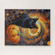 Um gato preto elegante com olhos que brilham como a lua de outono, um belo jack-o-lanterno, e um redemoinho de magia do Halloween no fundo, esta quebra-cabeça é uma mistura deliciosa de assustador e fofo. Ideal para amantes do Halloween e entusiastas do quebra-cabeça.
