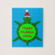 Esta incrível quebra-cabeça de serra mostra uma Tartaruga do Mar de Natal com uma casca verde e 4 pernas. A tartaruga está vestindo um chapéu vermelho e branco festivo. Tem olhos brancos e pretos bonitos e uma pequena cauda verde. A parte exterior do invólucro é decorada com folhas e bagas ocas alternadas e flores bonito de poinsettia vermelha.