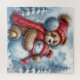 Imagem aquosa de um ursinho de pelúcia fofinho em trajes vermelhos de inverno abraça um bonitão de neve em uma floresta nevada