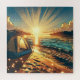 Bonito praia acampar o quebra-cabeça da safra com uma ilustração ai de uma tenda em uma praia enquanto o sol é ascensão. Ilustração Ai feita em uma arte hiper realista do estilo dos quadrinhos.