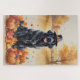 Uma pintura em forma de aquarela de um cão alegre sentado em meio a uma pilha de folhas vibrantes de queda, cercado por pequenas abóboras e bolotas espalhadas. O cachorro veste um chapéu de peregrino e fede de alegria, capturando o espírito da Ação de Graças. No fundo, campos de colheita suaves e árvores abrigadas em ouro criam um ambiente rural pacífico. Texturas gentis e tons de outono aquecidos dão à cena uma sensação acolhedora e nostálgica de celebrar a beleza da estação.