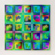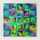 A imagem apresenta uma coleção vibrante de silhuetas de cão organizadas em um padrão de prancha de xadrez. Cada cão exibe uma combinação única de cores e padrões, criando uma composição divertida e viva.