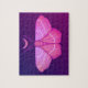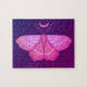Quebra-cabeça de mariposa em roxo e rosa com padrão mágico de bruxaria amarela na noite com meia lua e estrelas sobre fundo roxo escuro.
