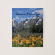 Esta imagem fotográfica mostra ao Teton grande a cordilheira em minha época do ano favorita - primavera do parque nacional, em um dia ensolarado com os céus azuis brilhantes claros, algumas nuvens brancas wispy, e neve nos picos de montanha, e um grupo inteiro das flores douradas que florescem no primeiro plano. Você pode personalizar este produto adicionando sua própria data, nome, ou mensagem.