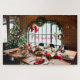 Bela cena tradicional do folclore do Janto de Natal espalhou-se na mesa. Anjos minúsculos enquadram a fonte festiva vermelha o nome da família Tipografia que você pode personalizar através do menu de edição do Zazzle. Uma maravilhosa Quebra-cabeça de Jigsera com um certo desafio para a família trabalhar juntos depois do almoço.