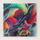 Uma composição vibrante apresenta uma intrincada mistura de formas giratórias e cores vívidas, formando uma paisagem abstrato. Elementos orgânicos como árvores e folhas são entrelaçados com padrões geométricos, criando uma cena dinâmica e harmoniosa.
