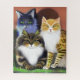 Quebra-cabeça num retrato de três gatos com atitude séria - estas caras significam negócios - um azul russo, um persa castanho e branco e uma mesa laranja e branca, riscada de tigre