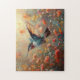 Um vibrante design de dissociação por aquarela, com um beija-flor arruinado, pairando entre flores delicadas, capturando a graça e a energia da natureza em floração.