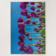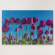 Um quebra-cabeça de quebra-cabeça divertido e desafiador com tulipas roxas brilhantes contra um céu azul de primavera