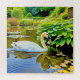 Um cisne sereno gira graciosamente através de uma lagoa tranquila, cercada por um verde-luxuoso e almofadas de lírios. Os tons vibrantes de ondulações verdes e suaves na água criam uma cena pacífica e idílica.
