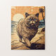 Design moderno e colorido, perfeito para o amante exótico de gato-de-shorthair e dono de gato exótico-de-shorthair. Um gato exótico de curta distância em uma praia tropical sob palmas e um pôr do sol ao fundo.