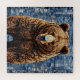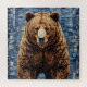 Arte vibrante que retrata um urso com um rico casaco de pelo texturizado, colocado contra um fundo de retalhos com tons azuis e cinzas. O urso permanece imponente e realista, capturando a atenção com suas características realistas.