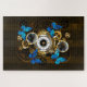 Composição do relógio de aço redondo com discagem numérica romana preta, decorado com engrenagens de ouro e latão, borboletas morfo azuis e lentes danificadas sobre fundo listrado castanho. Estilo Steampunk.