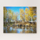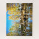 Essa quebra-cabeça de 526 peças tem cores contrastantes brilhantes em uma imagem de outono de vacas negras e brancas de Holstein no buraco de água abaixo e entre um povoado de árvores em folhas amarelas, douradas, verdes e laranja.