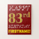 Estes divertimento e aniversário simples confundem características de design a mensagem "83rd ANIVERSÁRIO FELIZ", com "83rd" tendo o falso/imitação ouro-como a aparência da cor. Igualmente caracteriza um nome personalizado, e um vermelho coloriu o fundo. Poderia ser um divertimento e uma maneira especial entregar um aniversário personalizado que cumprimenta a alguém que está comemorando seu terceiro aniversário oitenta. [~Z0000200]