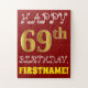 Este quebra-cabeça de aniversário simples e divertido mostra a mensagem "FELIZ 69º ANIVERSÁRIO", com o "69º" a ter uma aparência falsa e imitada de cor dourada. Ele também apresenta um nome personalizado e um fundo de cor vermelha. Pode ser uma maneira divertida e especial de dar uma saudação de aniversário personalizada a alguém que comemora seu sexagésimo nono aniversário. [~Z0000200]