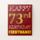 Este quebra-cabeça de aniversário simples e divertido apresenta a mensagem "FELIZ 73º ANIVERSÁRIO", com o "73º" a ter uma aparência falsa e imitada de cor dourada. Ele também apresenta um nome personalizado e um fundo de cor vermelha. Pode ser uma maneira divertida e especial de dar uma saudação de aniversário personalizada a alguém que comemora seus setenta e três anos. [~Z0000200]