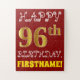 Este quebra-cabeça de aniversário simples e divertido apresenta a mensagem "FELIZ 96º ANIVERSÁRIO", com o "96º" a ter uma aparência falsa e imitada de cor dourada. Também apresenta um nome personalizado e um fundo de cor vermelha. Pode ser uma maneira divertida e especial de dar uma saudação de aniversário personalizada a alguém que comemora seu 96º aniversário. [~Z0000200]