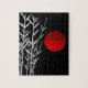 Bambu-árvores e sol vermelho em círculo negro e redondo desenhado à mão com tinta na tradicional pintura japonesa