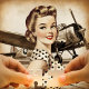 Uma ilustração vintage de uma jovem ao estilo pin-up clássica, com um penteado vitorioso. Ela está vestindo um vestido de bolinhas e batom vermelho, e tem um olho alado. A mulher está ao lado de um avião da 2ª Guerra Mundial. O fundo é um campo de aviação antigo. A imagem tem um tom de sepia e uma textura de papel envelhecida. O estilo lembra os anúncios dos anos 50 e tem elementos do Art Deco. Copyright Soar em Style Design LLC.