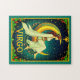 Quebra-cabeça em uma mulher com vestes brancos fluidos, com uma flor em seu cabelo, sentada graciosamente em uma lua crescente ouro, cercada por estrelas. Ornamentado Art Nouveau enquadrado com flores, e a palavra "VIRGO", completam a ilustração celestial zodiac.