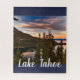 Foto colorida do lago Tahoe, Califórnia - Nevada. Fundo azul escuro com sobreposição de texto branco