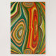 Esta imagem de abstrato é uma vibrante espiral de cores, com uma mistura de verdes, laranjas, vermelhos, amarelos e castanhos. Os padrões lembram-se de fluido, movimento fluido, criando um efeito orgânico, quase psicodélico. A imagem tem uma aparência dinâmica e giratória, com formas concêntricas ovais e linhas ondulantes que criam um sentido de profundidade e movimento. Escala de Dificuldade 1-10: 7