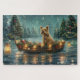Mergulhe na magia da temporada de férias com esta ilustração lindamente detalhada, mostrando um cachorro orgulhoso sentado em um barco festivamente decorado, deslizando através de um lago de Natal sereno. As luzes cintilantes dos pinheiros próximos refletem sobre a água, lançando um brilho quente e festivo que melhora o conforto ambiente. Os ornamentos pendem do lado do barco, enquanto as lanternas brilhantes iluminam o caminho, criando uma cena que captura a verdadeira essência do calor e alegria natalinos. Esta trabalho de arte nostálgica traz um toque de magia de férias para qualquer espaço, perfeita para aqueles que apreciam o espírito da estação.