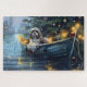 Mergulhe na magia da temporada de férias com esta ilustração lindamente detalhada, mostrando um cachorro orgulhoso sentado em um barco festivamente decorado, deslizando através de um lago de Natal sereno. As luzes cintilantes dos pinheiros próximos refletem sobre a água, lançando um brilho quente e festivo que melhora o conforto ambiente. Os ornamentos pendem do lado do barco, enquanto as lanternas brilhantes iluminam o caminho, criando uma cena que captura a verdadeira essência do calor e alegria natalinos. Esta trabalho de arte nostálgica traz um toque de magia de férias para qualquer espaço, perfeita para aqueles que apreciam o espírito da estação.