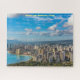 A bela vista do ponto de vista da cratera de Diamond Head. Arranha-céus da cidade de Waikiki e Honolulu ao longo da costa e com um céu nublado branco sujo.