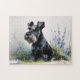 A soft watercolor-style illustration of a calm schnauzer seated among delicate blue wildflowers and meadow grasses, featuring gentle textures, a light neutral background, and a peaceful, natural atmosphere.