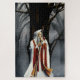 Um mago todo branco, vermelho e ouro está segurando um funcionarios com as duas mãos com um carvalho muito velho atrás dele e uma floresta ao redor. Um corvo preto está atrás dos ombros do bruxo.