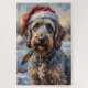 This textural acrylic painting captures the rugged look of the Wirehaired Pointing Griffon, wearing a rustic Santa hat and standing proudly with a feather. A detailed, unique holiday design for fans of this sporting breed.