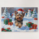 Quebra-cabeça Yorkipoo correndo em neve com chapéu de Natal